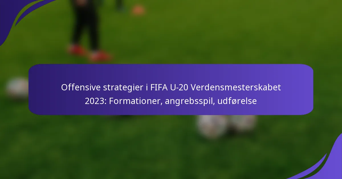 FIFA U-20 Verdensmesterskabet 2023 fremhævede en række offensive strategier, der fokuserede på hurtige overgange og effektiv udnyttelse af plads. Holdene anvendte strategisk forskellige formationer, såsom 4-3-3 og 4-2-3-1, for at forbedre deres angrebsspil og tilpasse sig modstandernes taktik. Gennem velkoordinerede bevægelser og innovative taktikker havde disse hold til formål at maksimere deres scoringsmuligheder og navigere succesfuldt gennem defensive udfordringer.